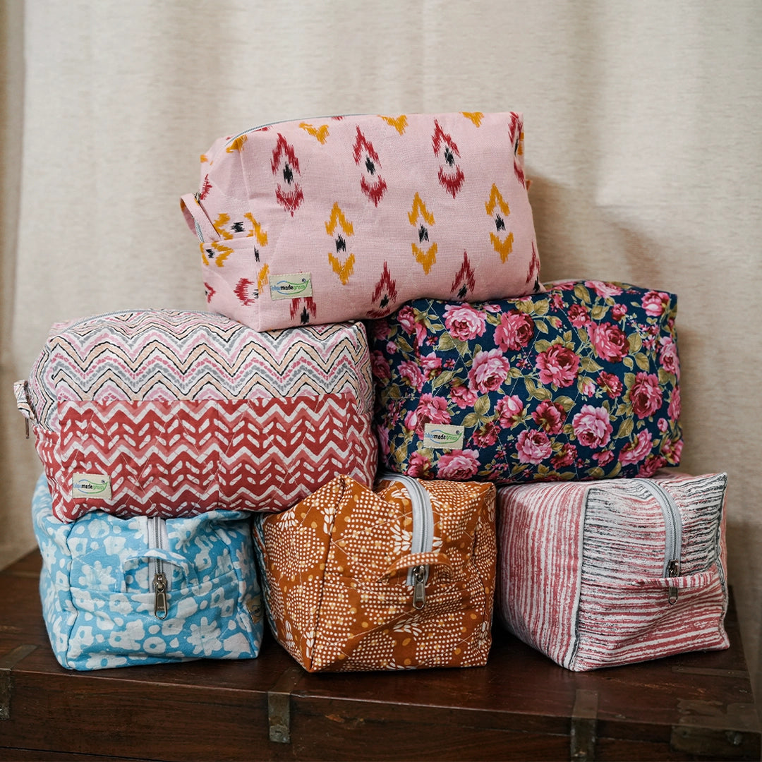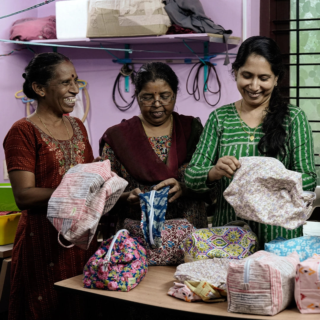 A roomy, one-of-a-kind wash bag made from upcycled fabrics. Handmade by women in India to champion zero waste living and spark feel-good conversations around plastic-free, planet-friendly beauty.
